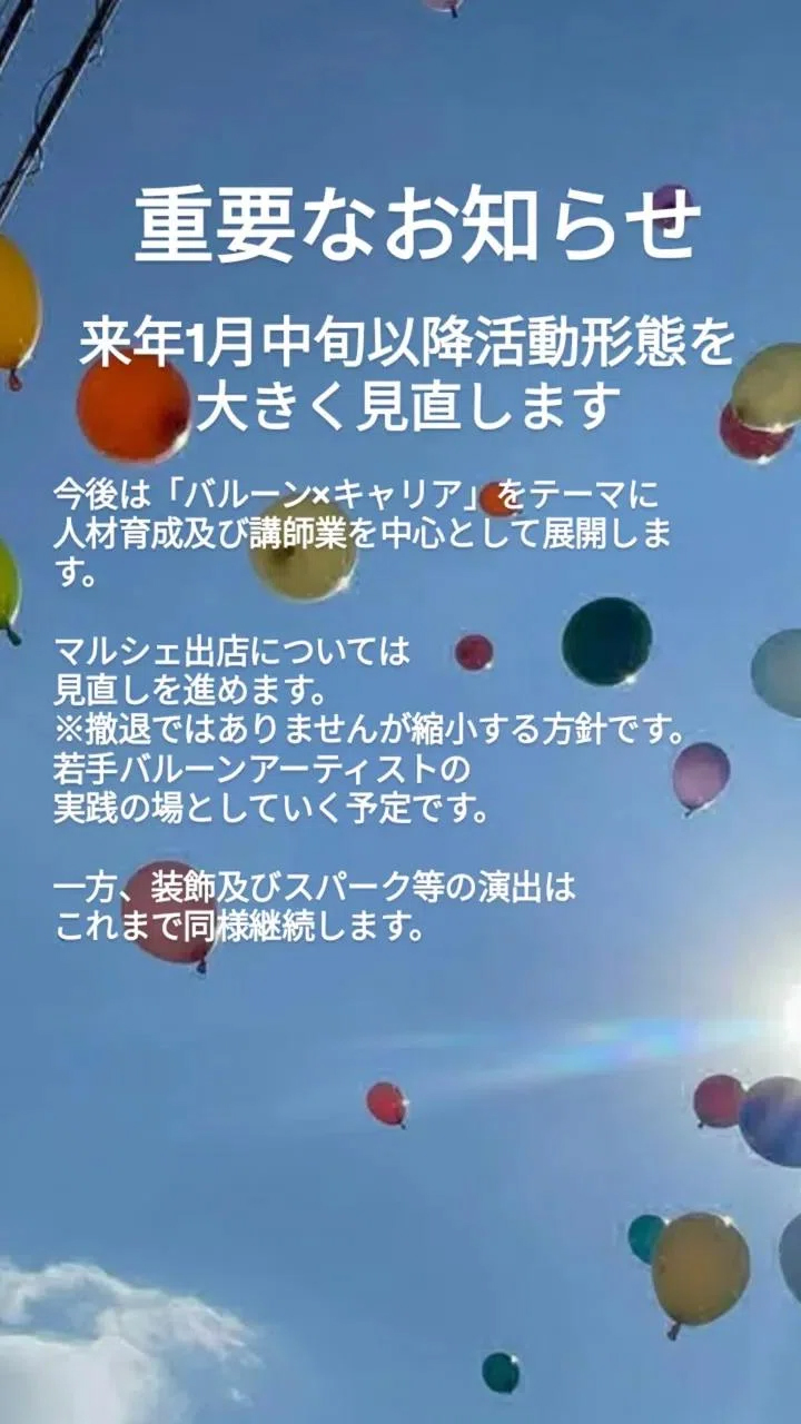 来年1月中旬以降活動形態を大きく見直します。今後は「バルーン×キャリア」 をテーマに、人材育成及び講師業を中心として展開します。 マルシェ出店については見直しを進めます。 ※撤退ではありませんが縮小する方針です。 若手バルーンアーティストの実践の場としていく予定です。 一方、装飾及びスパーク等の演出は これまで同様継続します。