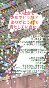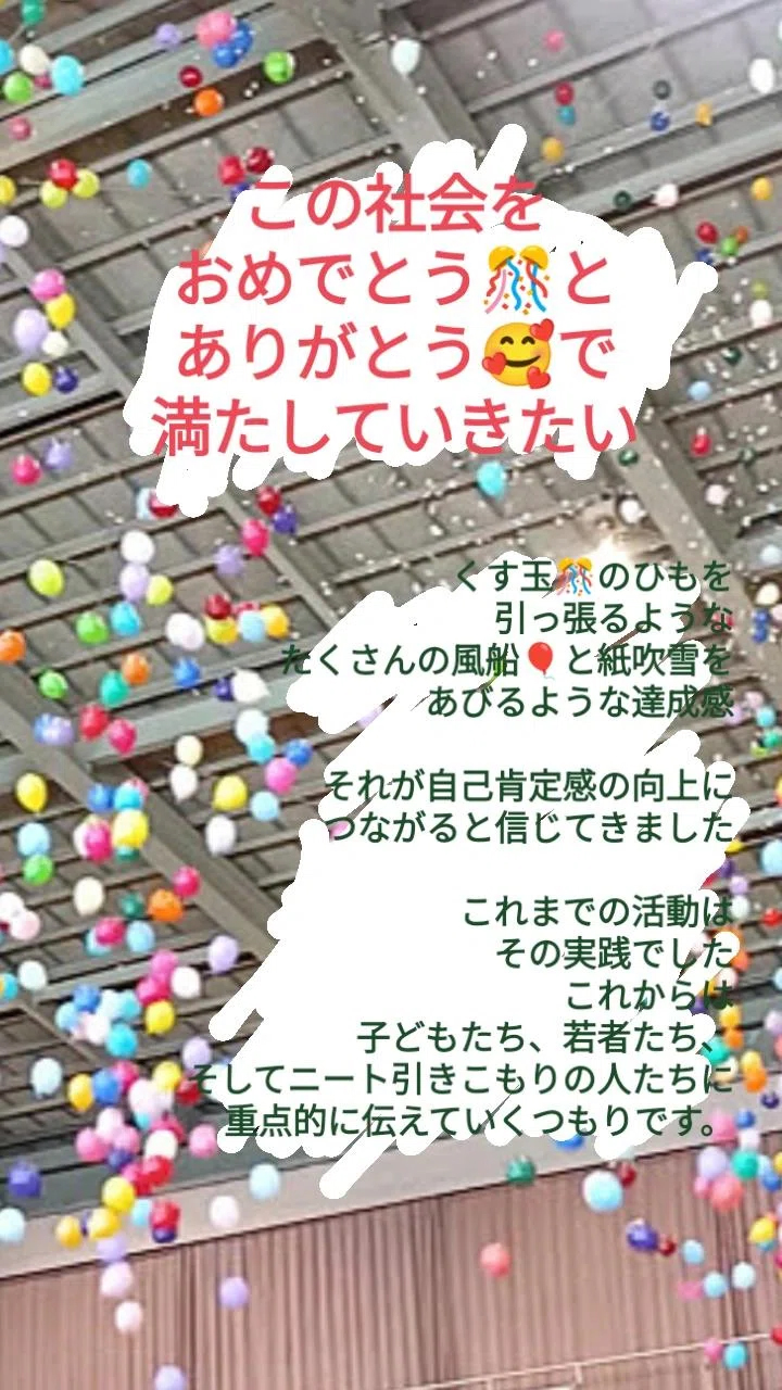 この社会をおめでとうとありがとうで満たしていきたいくす玉のひもを引っ張るような、たくさんの風船と紙吹雪をあびるような達成感。それが自己肯定感の向上につながると信じてきました。 これまでの活動は その実践でした。これから子どもたち、若者たち、 そしてニート引きこもりの人たちに、重点的に伝えていくつもりです。