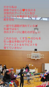 だから私は、技術ではなく心を伝える、次世代のアーティスト及びセラピストを育成することに舵を切る。一部で引退説が流れているが、引退ではなく次のステージに進むのが正しい。これからは、くす玉祭のひもを引っ張る手助けができる、アーティスト&セラピストを育てていきたい。