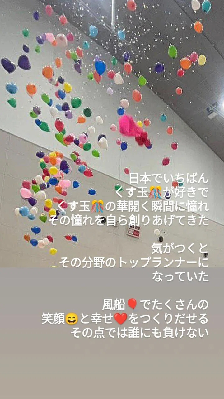 日本でいちばんくす玉が好きで、くす玉の華開く瞬間に憧れ、その憧れを自ら創りあげてきた。気がつくとその分野のトップランナーになっていた。風船でたくさんの笑顔と幸せをつくりだせる、その点では誰にも負けない。
